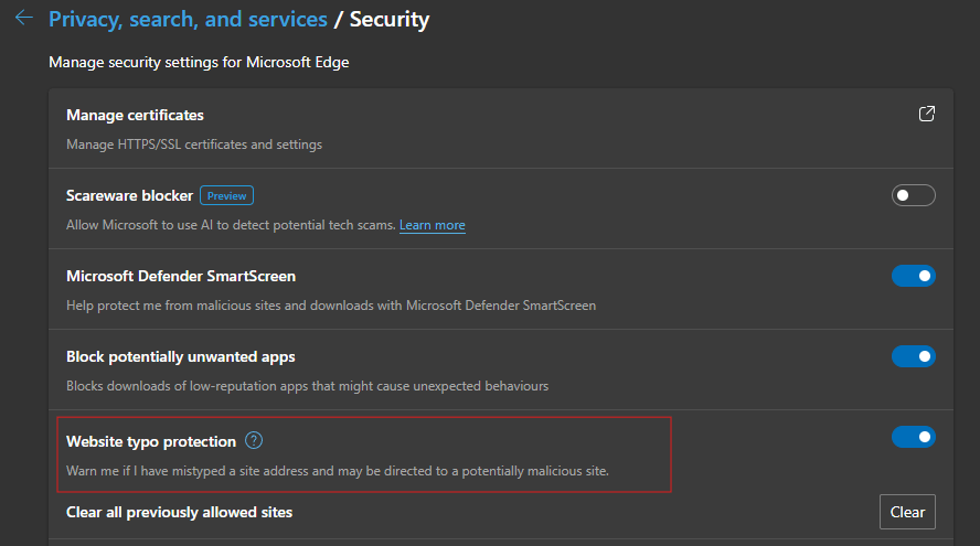 To turn this feature on, in Microsoft Edge, go to Settings > Privacy, search, and services > Website typo protection;