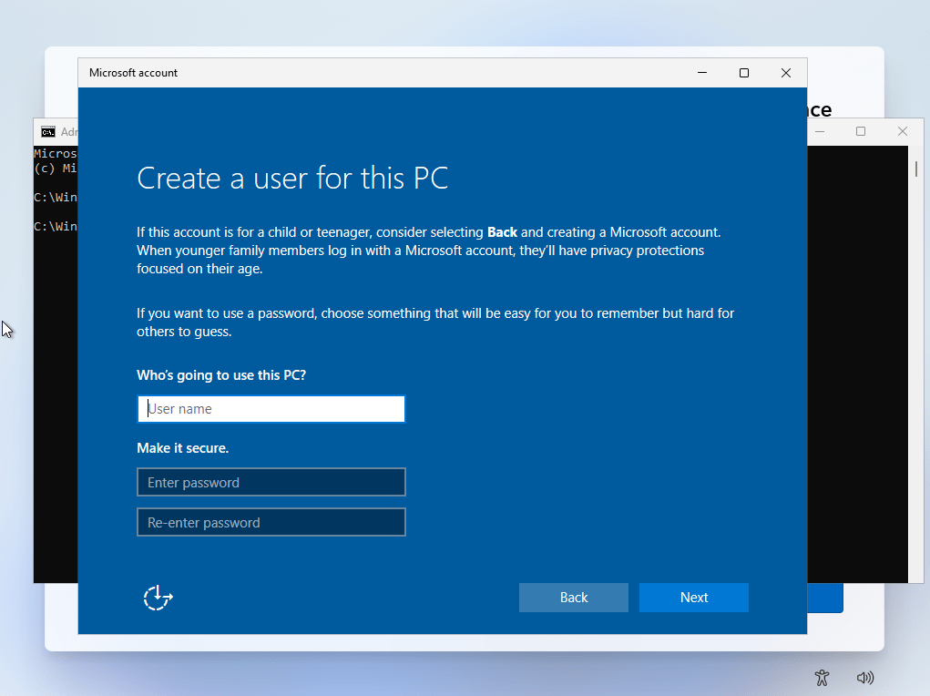 Once you hit the Enter key, a ‘Create a user for this PC’ Window will appear;
