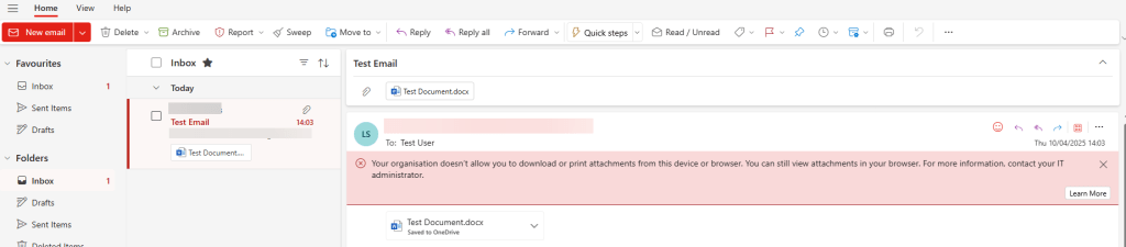 Currently, as it stands, an email comes in with an attachment, it gets saved to OneDrive. They can just open OneDrive on the Web and download that file. We now need to restrict that. That’s create that final policy.