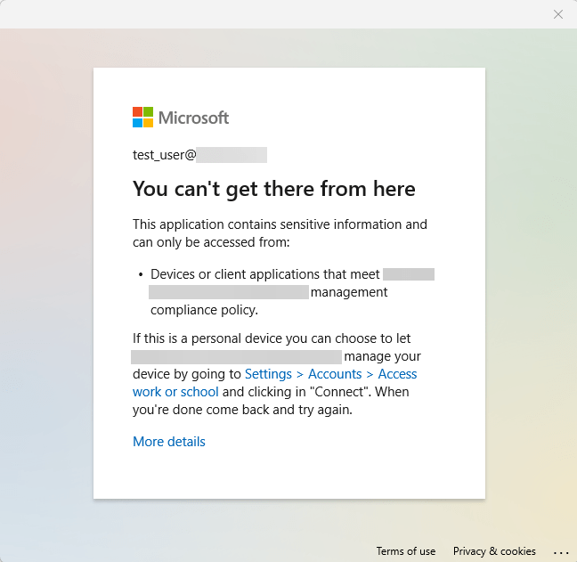 The above policy states, if the device is not compliant then don’t allow access to the Desktop Apps. If they attempt, they get the following message;