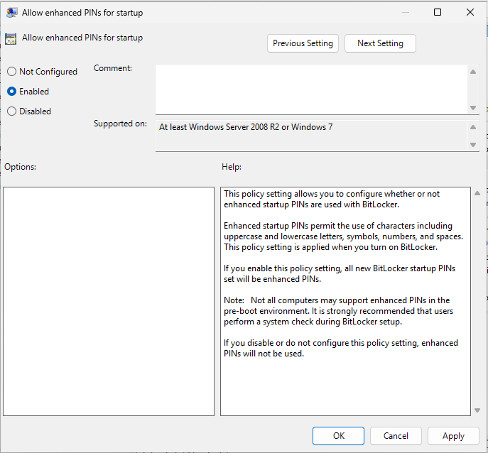 Allow enhanced PINs for startup > Enable > Apply > Ok.