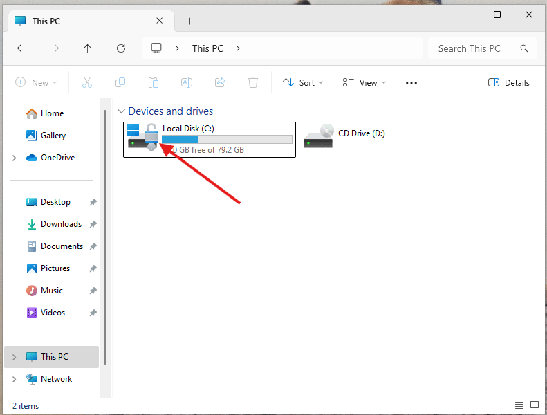 Back in File Explorer > This PC > your C Drive now is encrypted, as seen by the padlock.