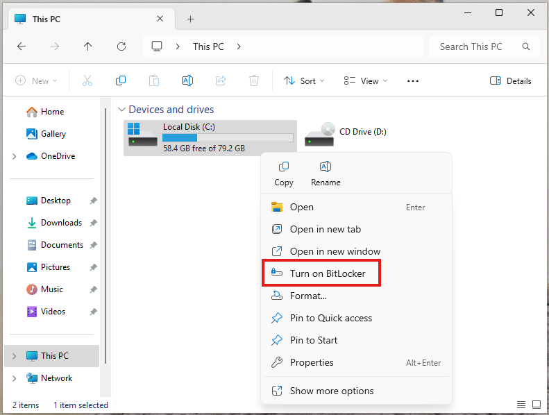 Open up File Explorer > This PC > Right-click on your C Drive > Turn on BitLocker.