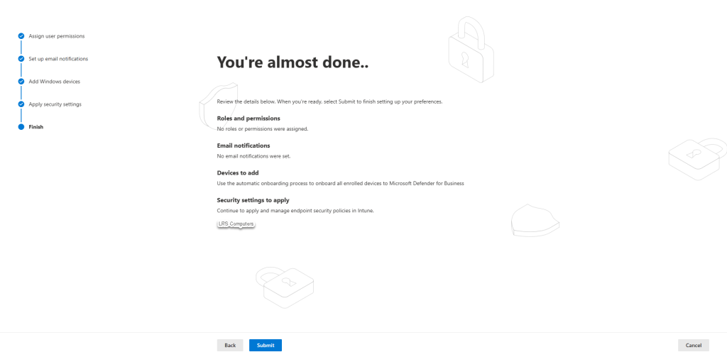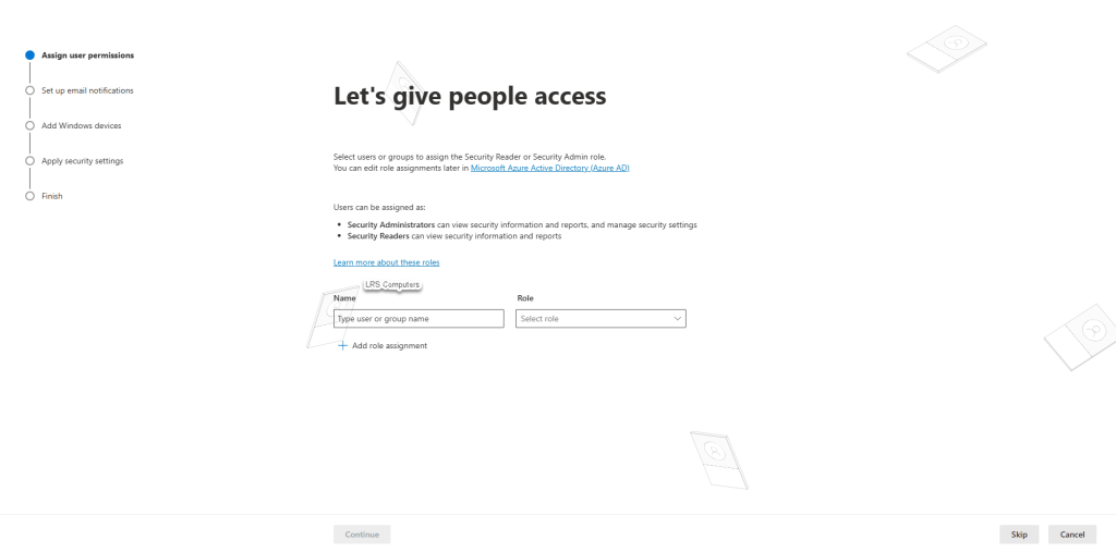 Let’s give people access – you may have staff members internally, that you don’t have Global Admin roles but you want them to be able to manage Defender for Endpoint to a degree – at this prompt, you can either give some Security Administrator or Security Reader permissions, more information – Microsoft – Defender for Cloud.