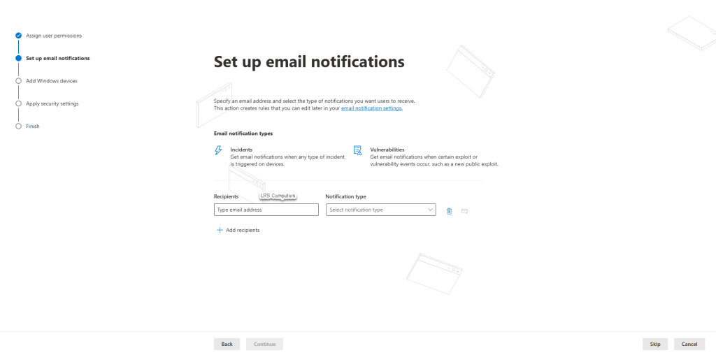 Email notifications, again, this is down to your own practices and requirements. You may have a shared mailbox, or a specific user you want alerts to go to or you can skip;
