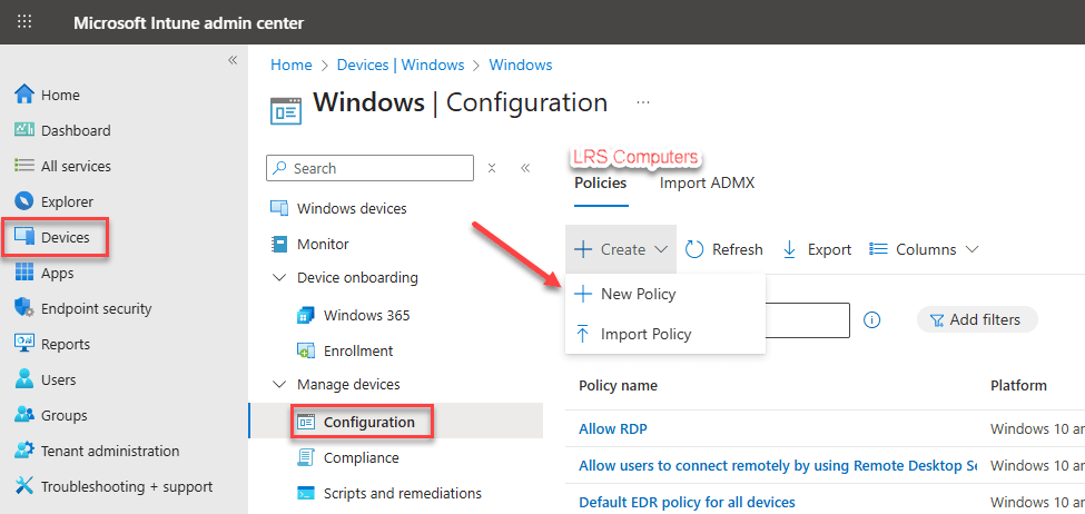 Log into the Intune Admin Portal (https://intune.microsoft.com/) > Devices > Windows > Configuration > Create > New Policy;