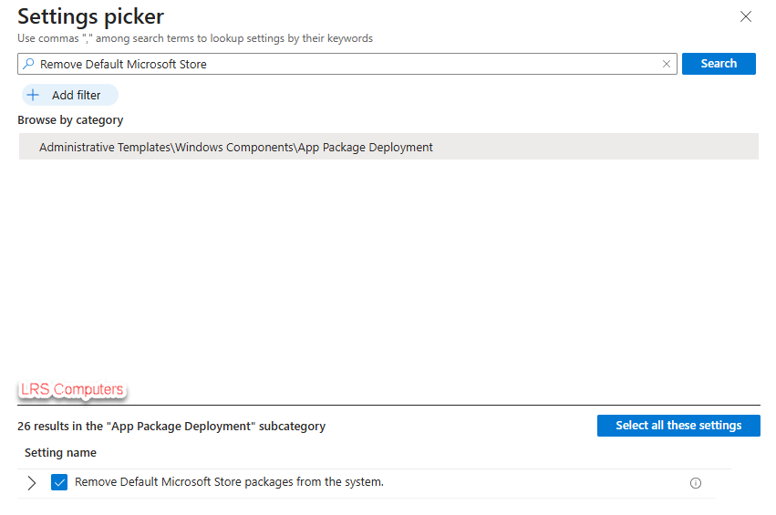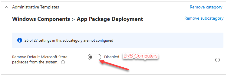 Search for Remove Default Microsoft Store or search through the categories (Administrative Templates\Windows Components\App package deployment) and we are looking for Remove Default Microsoft Store packages from the system, then tick the box