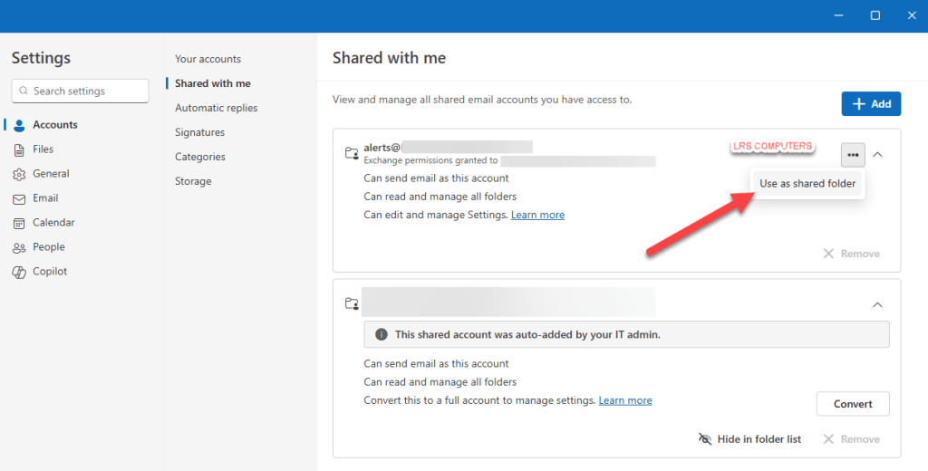 If you wish to return in back to shared type mailbox, click on the three dots and use as a shared folder;